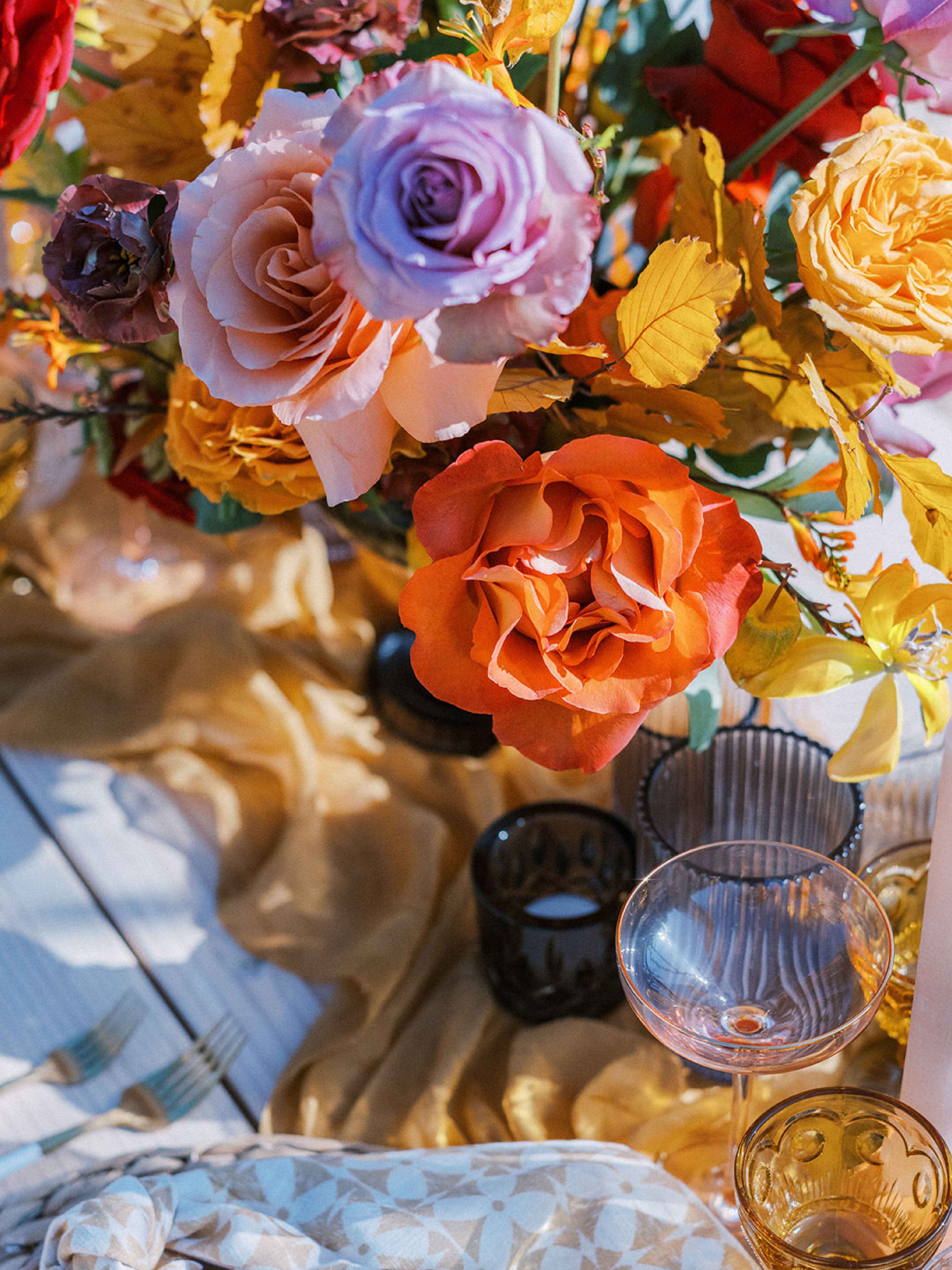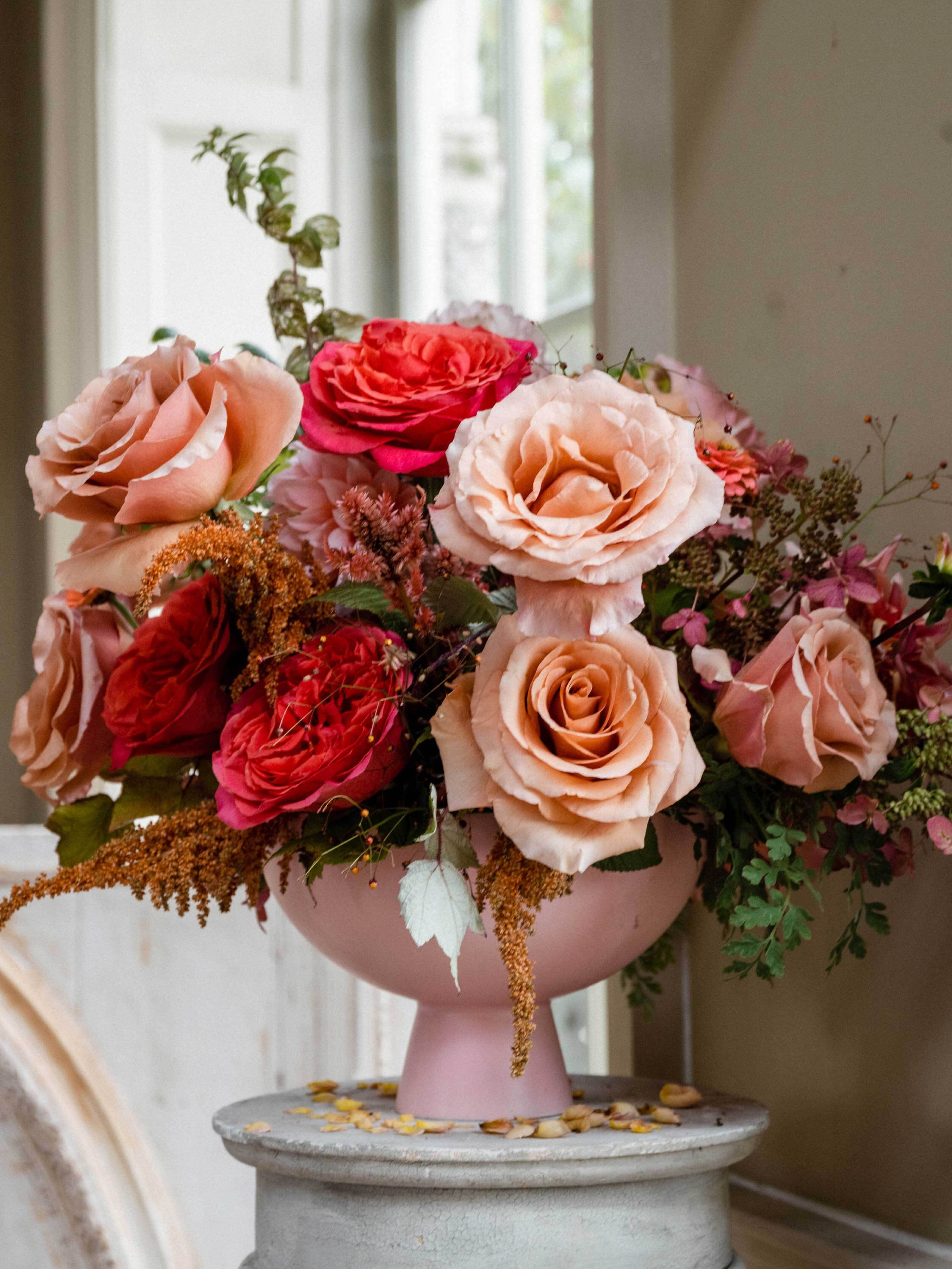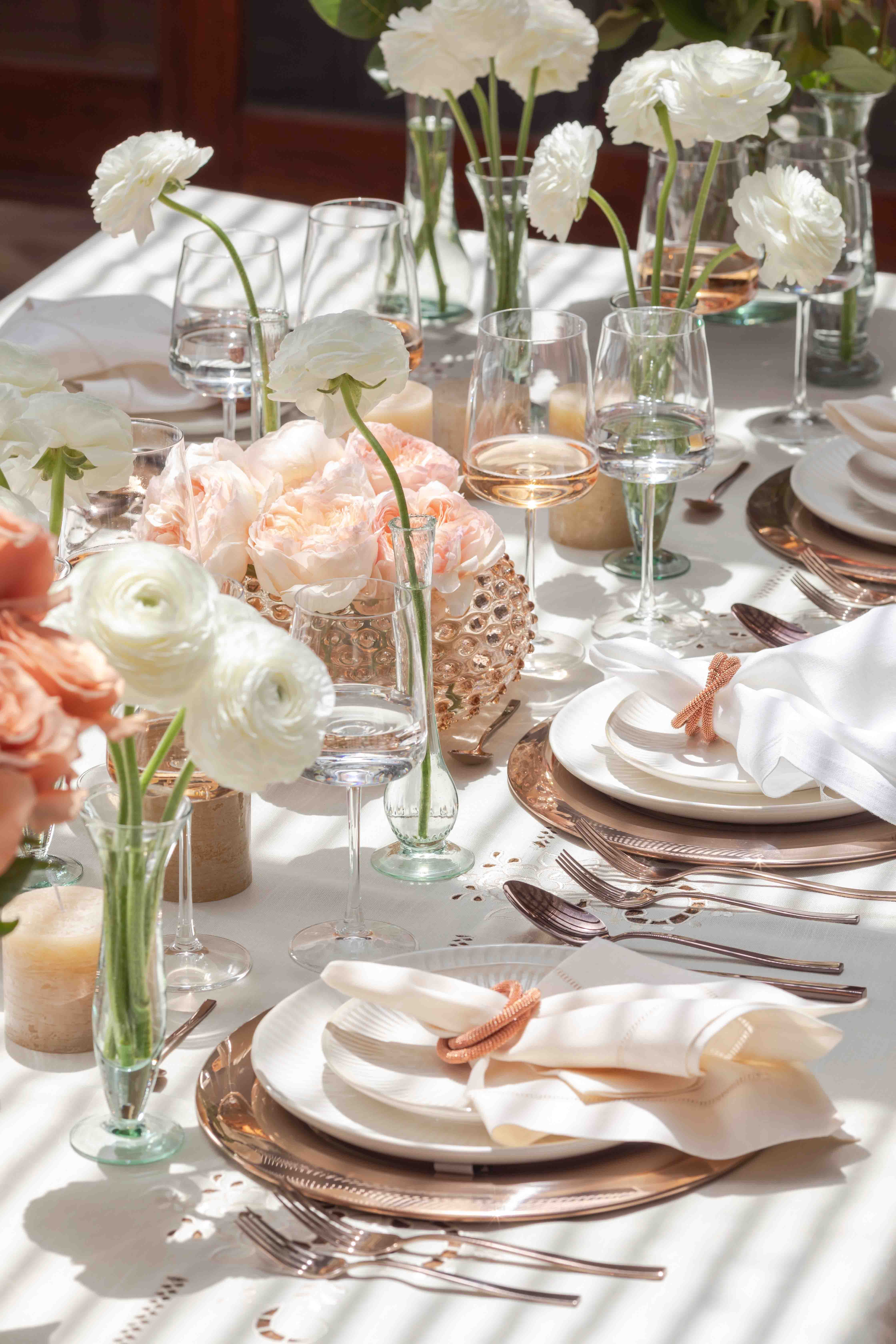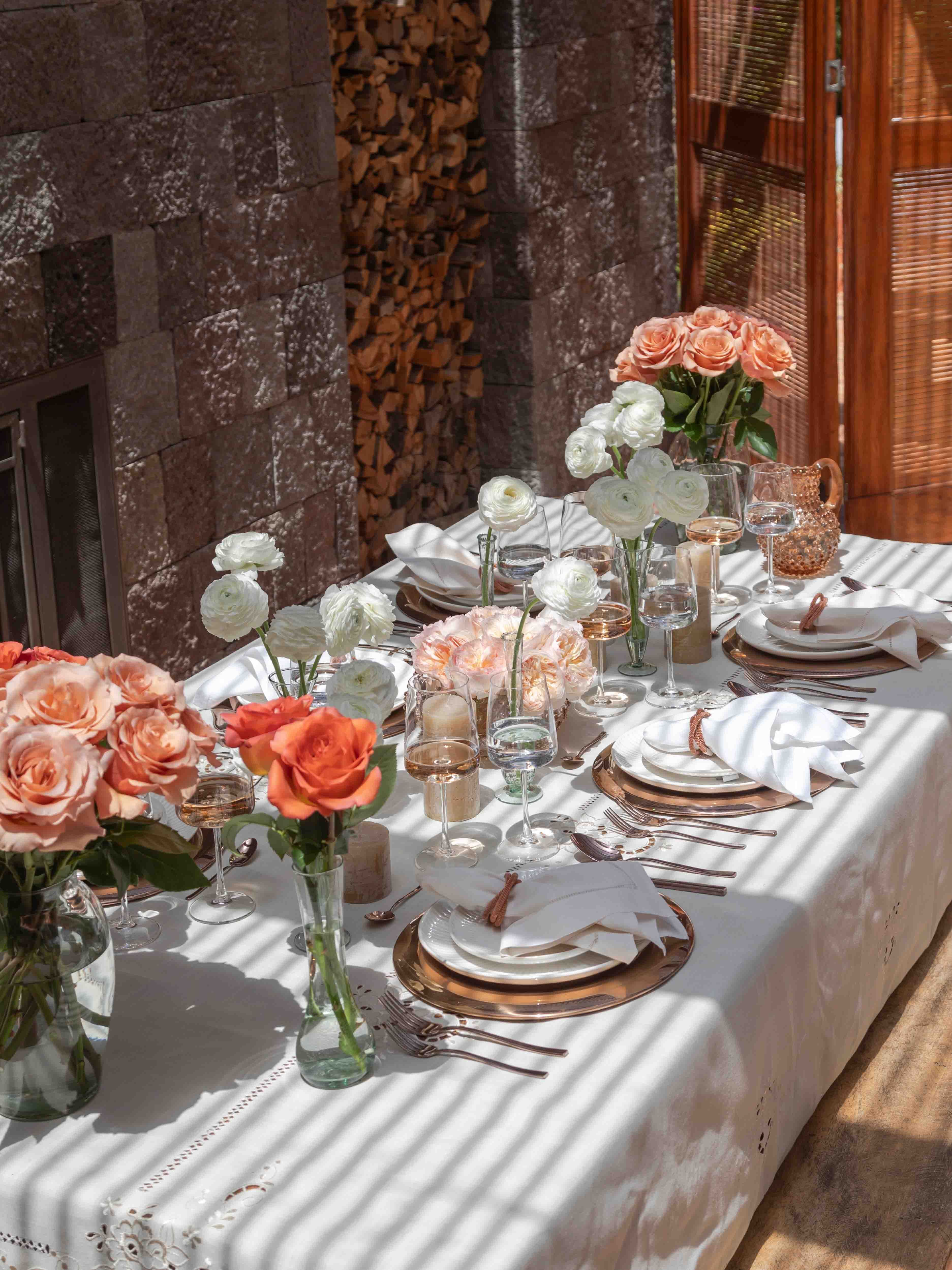This year, we learned valuable tips from the renowned floral designer Christy Husley from Colonial House of Flowers. During our Thanksgiving live session, she shared her insights on using floral arrangements to elevate holiday decor. She paired Rosaprima roses with Floraprima ranunculus and anemones to create the perfect flower centerpiece for Thanksgiving. She used the traditional RP Black Pearl with RP Moab's light sienna color, the peach David Austin Juliet, and the contemporary hues of the ranunculus Cloni Success Mambo, Specialty Pon Pon Lavender, and the anemone Mistral Bianco.
