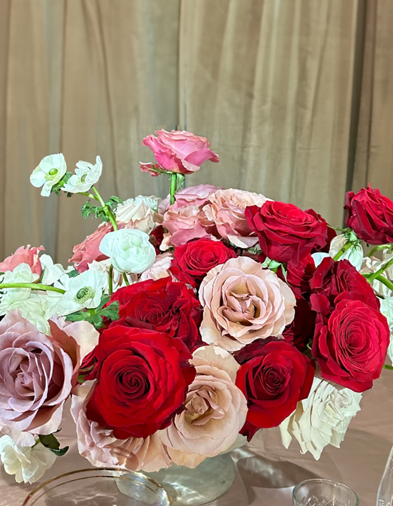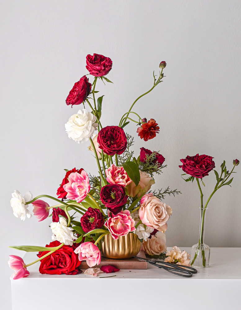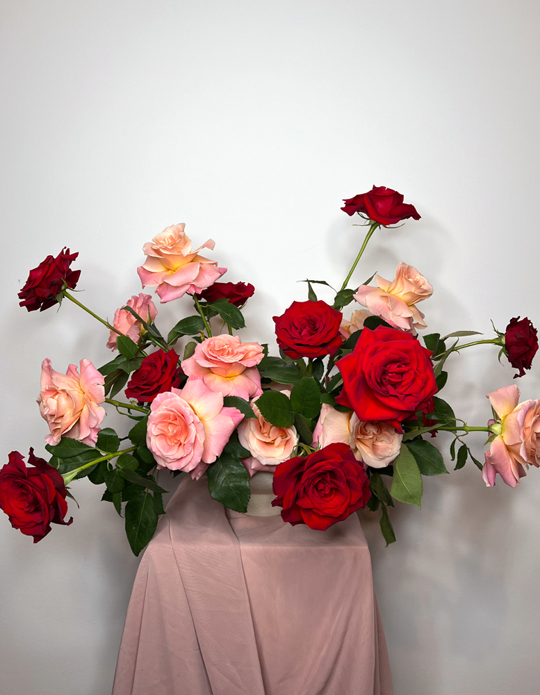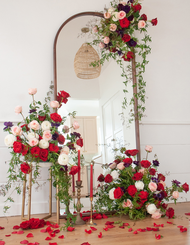 "Showcasing other blooms with red roses helps the red roses shine and stand out even more! A backdrop of pink makes the reds more red, and hints of white make them feel more rich and velvety. "