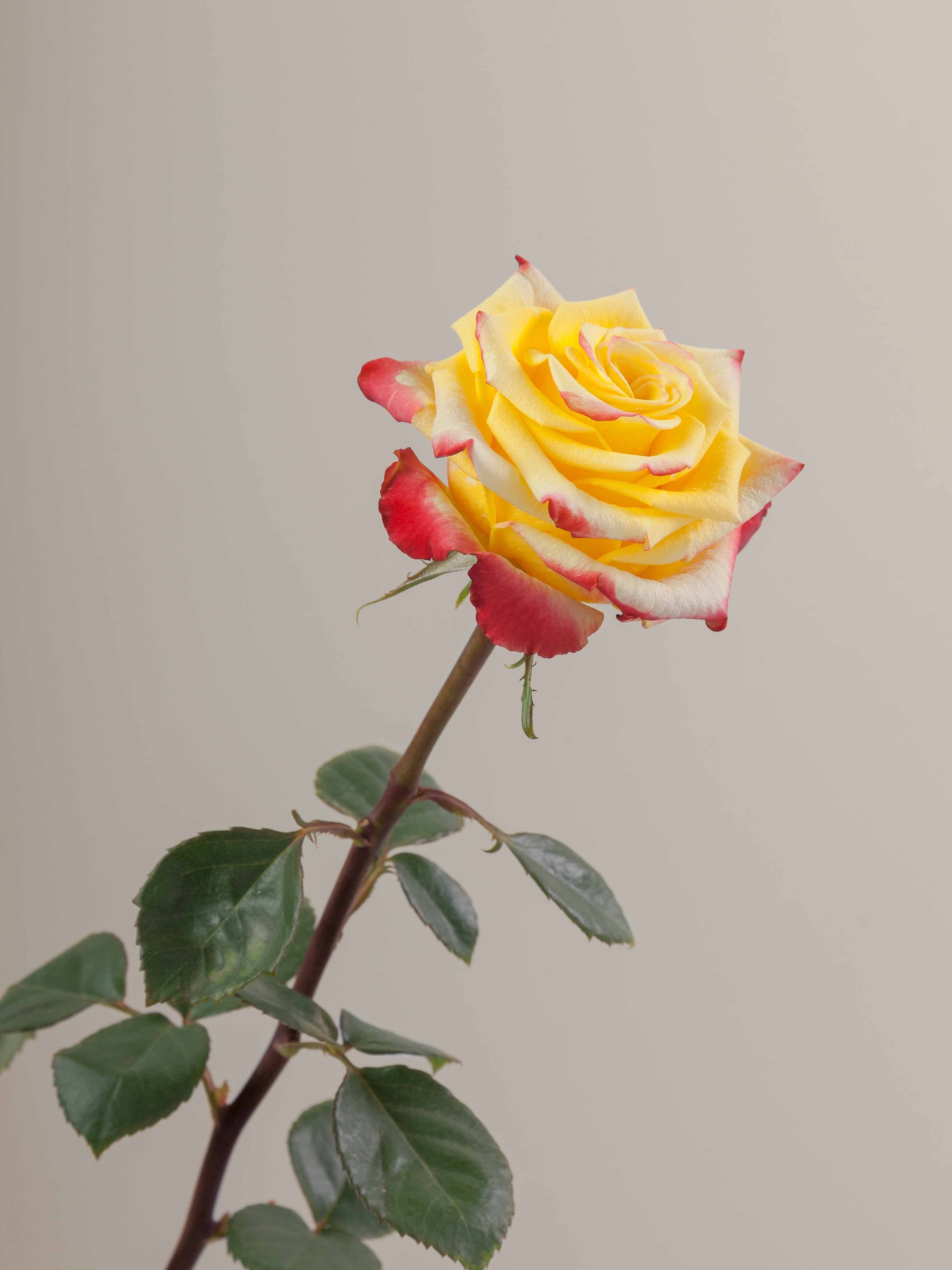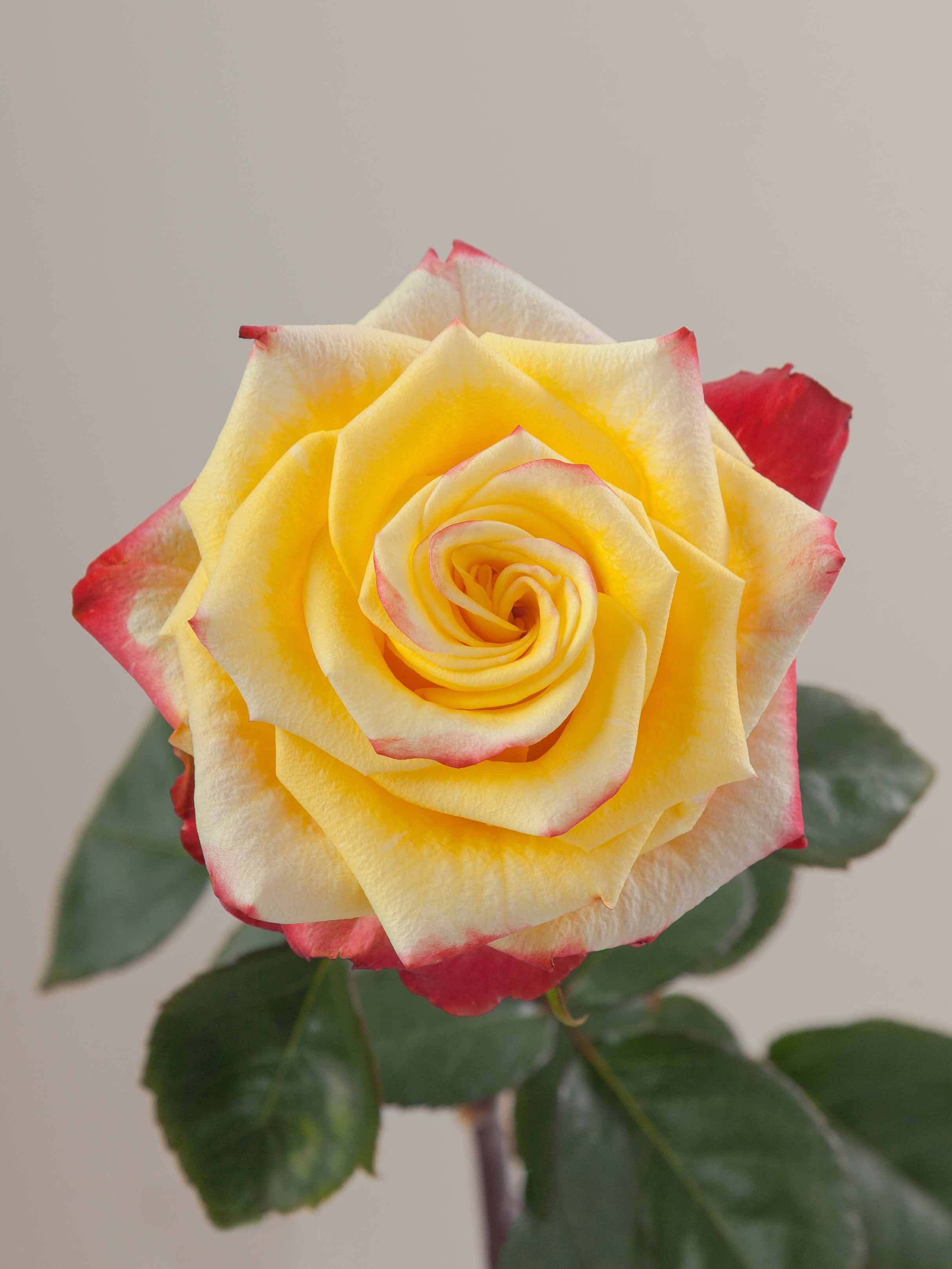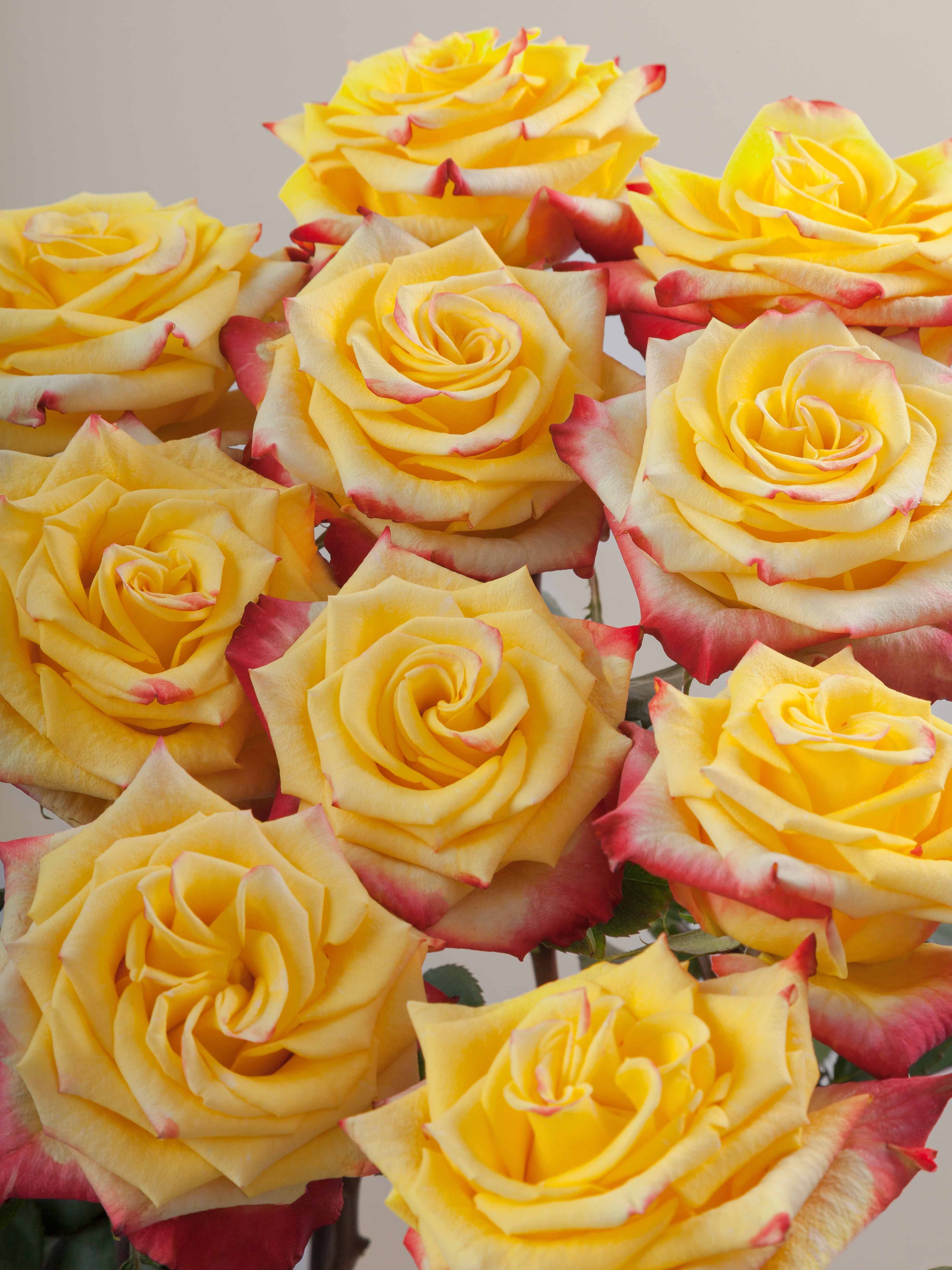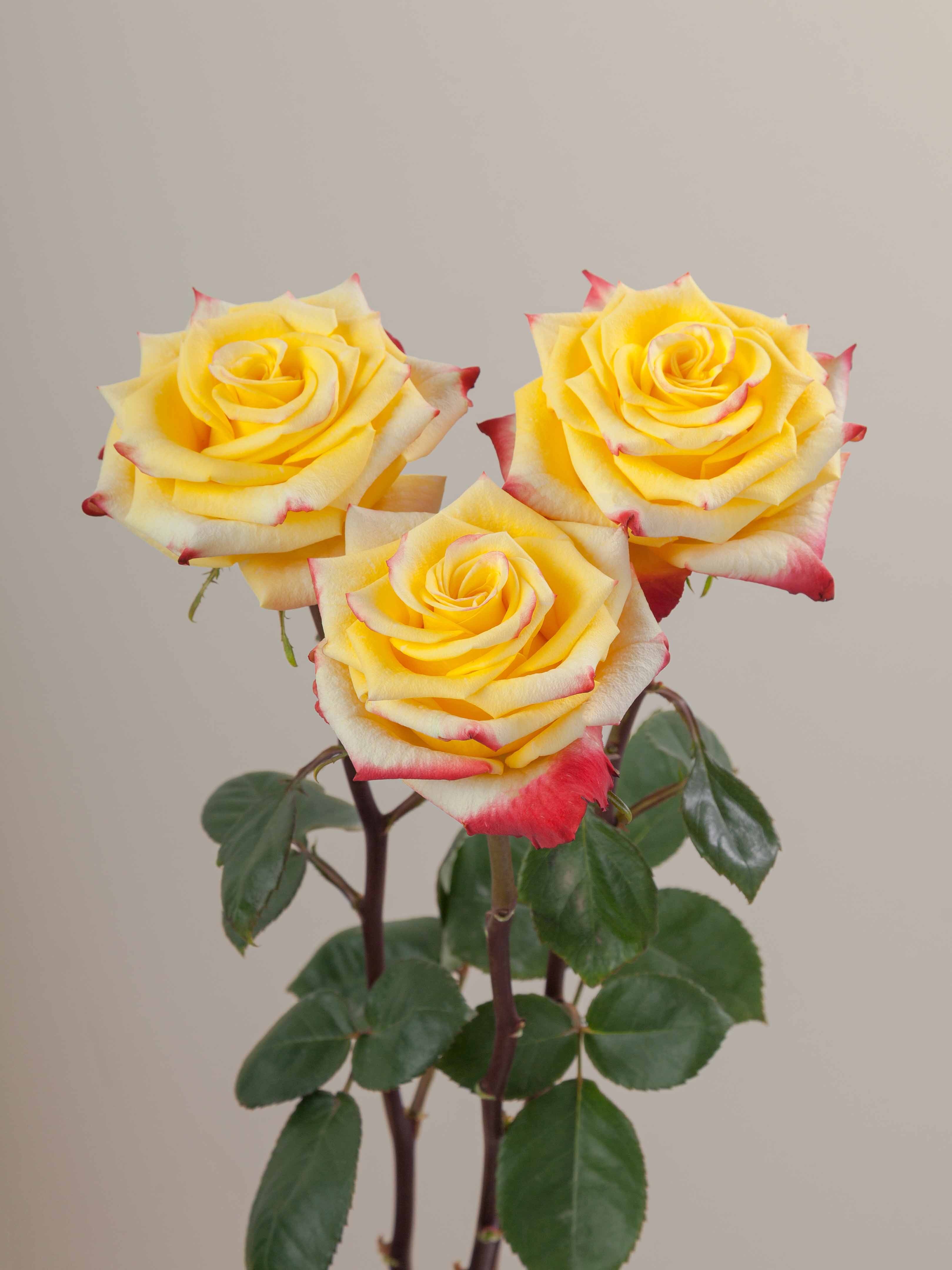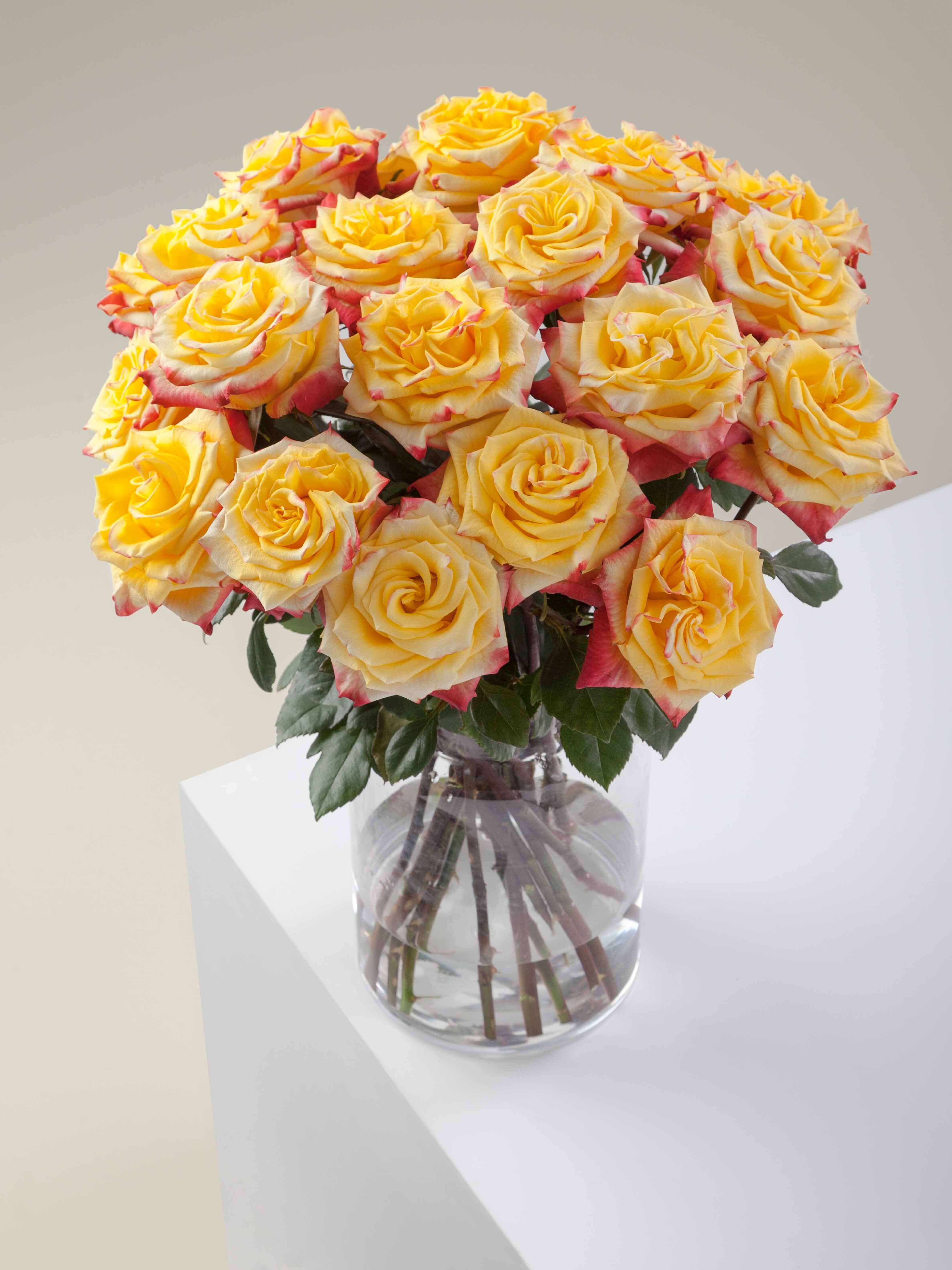 A bi-colored yellow rose variant with a flair of red on the outer petals. For those who want to add new energy to an old favorite.