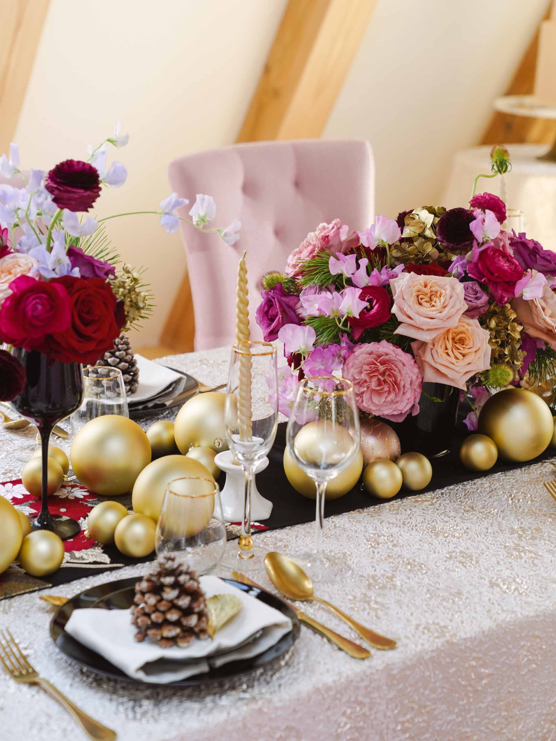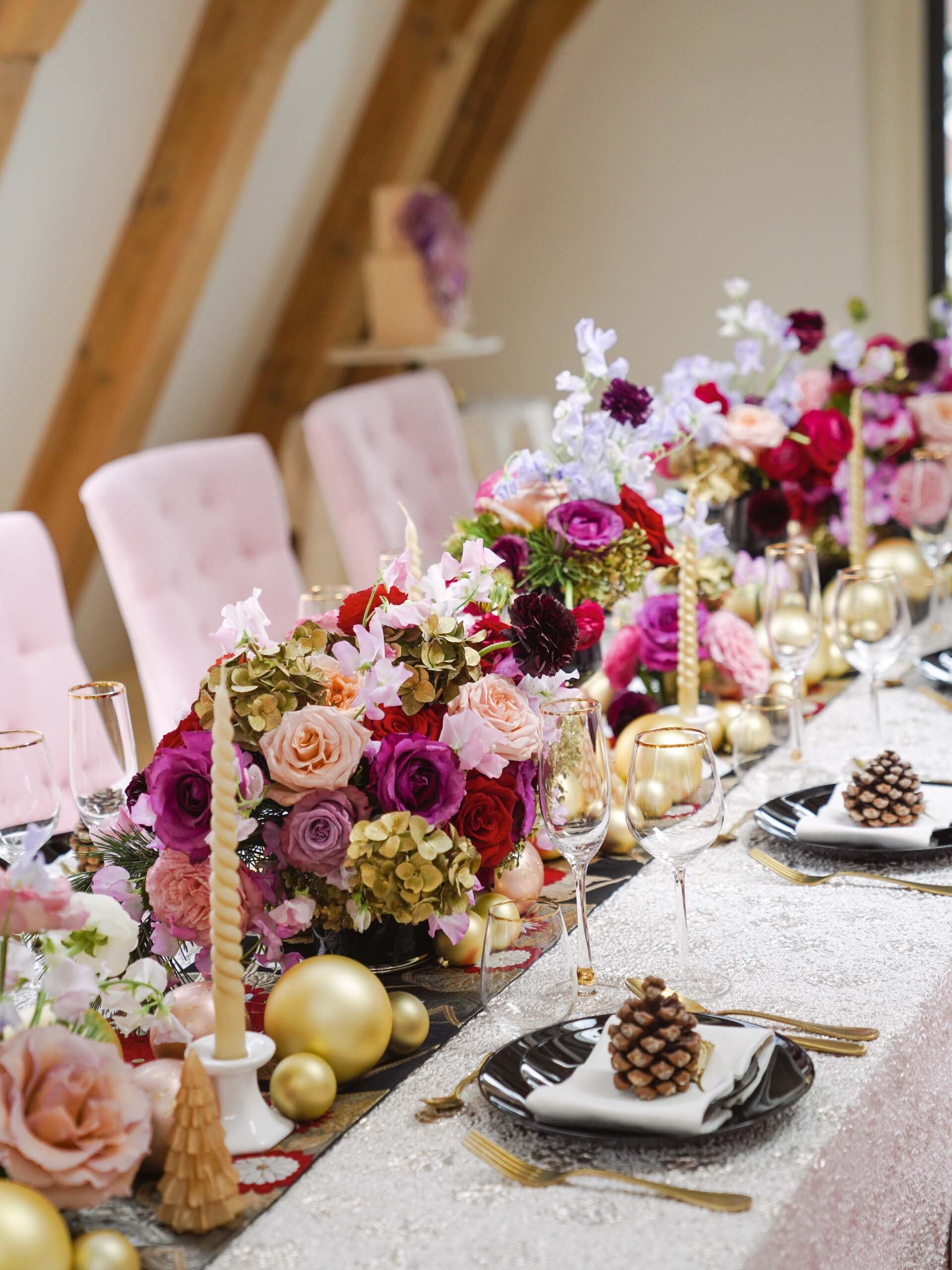 For this project, Katya used six varieties of our beautiful roses to create an exquisite Christmas arrangement. She chose Shimmer, Mayra’s Pink, RP Moab, Mamy Blue, Govinda, and Explorer roses – along with a range of different shades of ranunculus.
